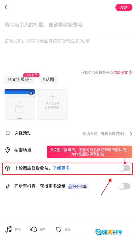 1、点击软件中央的加号图标进入内容发布页面,在图片区域的下方有一个【授权图库换收益】的选项,需开启该功能方可参与收益获取。