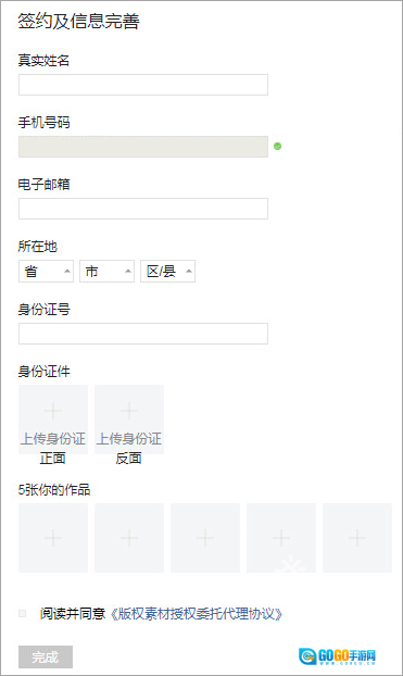 2、请填写个人信息,并上传五张个人摄影作品(建议提交最满意的作品用于申请),填写完毕后点击“完成”按钮,编辑将在7个工作日内完成审核。