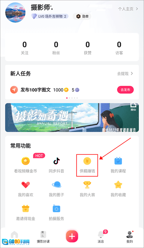 1、打开图虫,进入“我的”界面后,在常用功能区域找到并点击“供稿赚钱”选项。