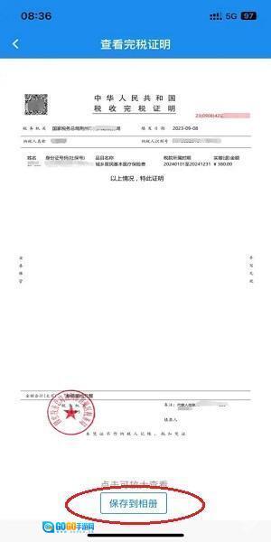 7.若需要凭证,可在上一步操作中点击“打印完税凭证”,接着点击下方的“保存到相册”,即可将完税证明保存至手机。