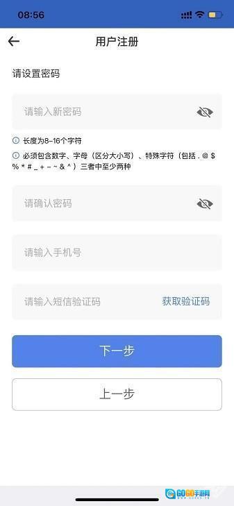 4.按要求设置密码(点击设置密码旁的眼睛图标,可显示输入的密码),填写手机号并获取验证码,然后点击【下一步】