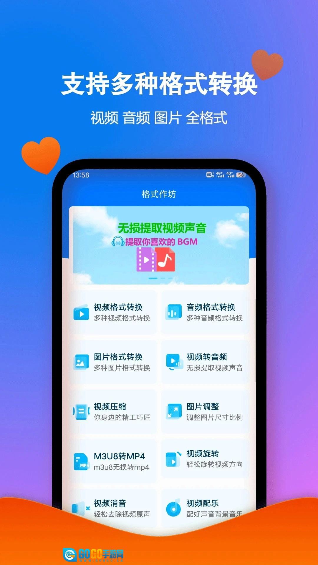 格式作坊是一款实用的手机工具箱,具备多样功能选项,支持用户自由选择各类格式进行转换,畅享优质服务。它还提供无损音频提取、视频压缩等功能,用户可随时随地随心使用,轻松体验便捷操作。此外,其个性化界面设计让无经验者也能快速上手,方便用户自由管理和保存不同格式的文件,全方位满足各类使用需求。平台还配备在线客服,助力用户轻松解决格式相关问题,有需要的用户欢迎前往本站获取该软件。