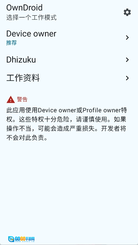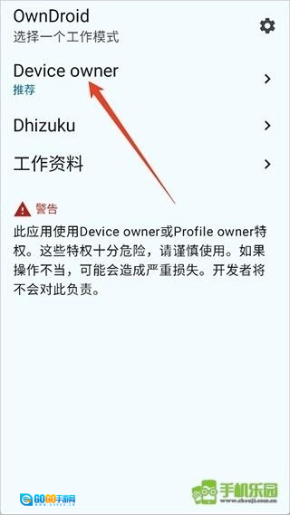 1、打开OwnDroid后,用户能够挑选一种工作模式来启动,在此建议选用Device Owner模式。