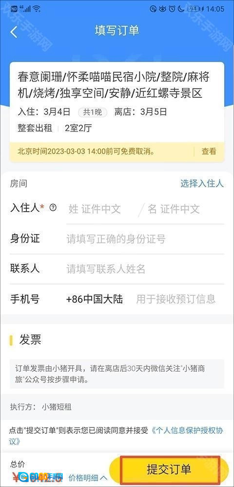 5、接着在填写订单时,依次填好入住人信息、身份证号码以及联系人手机号,之后仔细查看订单详情,确认所有信息无误后,找到并点击“提交订单”按钮。