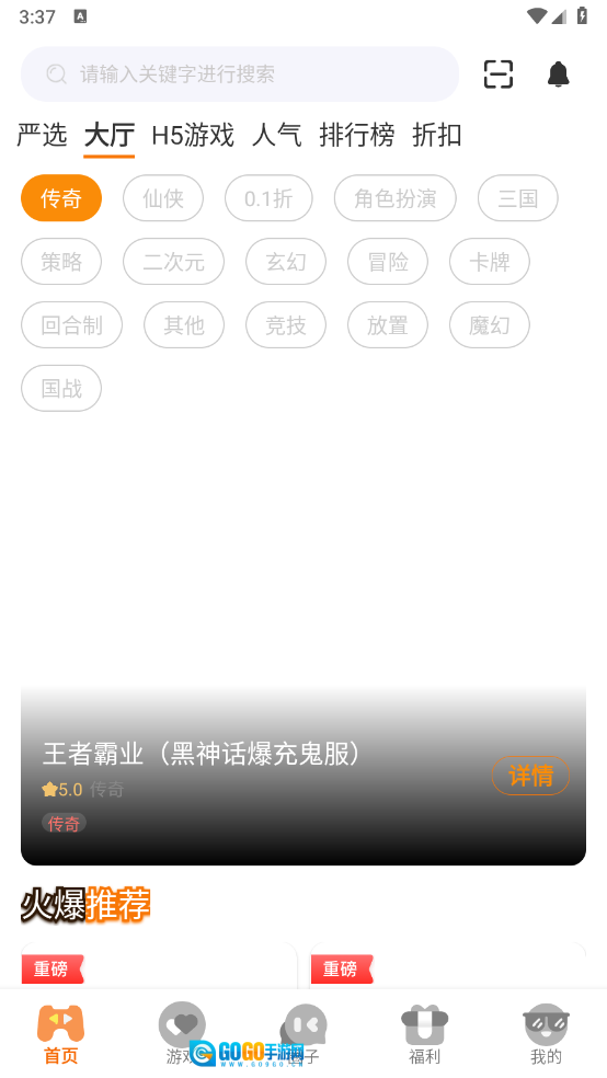 1、首页为玩家设置了热门游戏推荐区域,涵盖大厅、H5游戏,以及人气、折扣等各类板块。