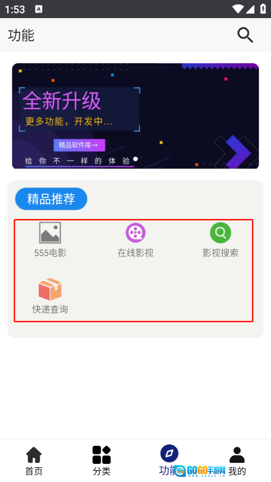6、“功能”页面整合了在线影视、影视搜索与快递查询这几项功能,点击即可直接使用。