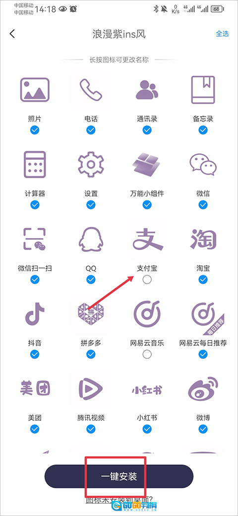 3、接着点击一键安装就可以了,如果有不想更换的图标,把对应的勾选取消掉就行。