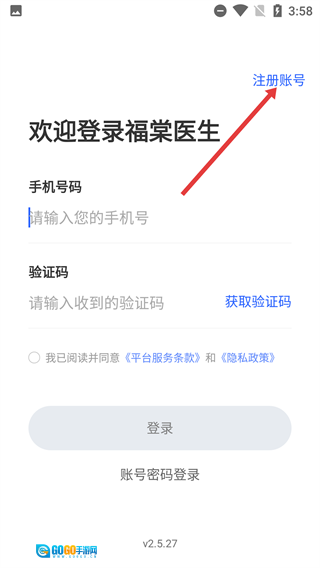 2、在“欢迎登录福棠医生”页面,点击右上角的【注册账号】选项,即可进入账号注册操作页面。