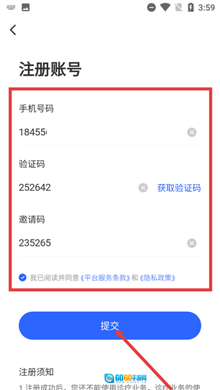 3、进入注册账号页面后,按顺序填写手机号码、获取并输入验证码、填写邀请码,随后点击【提交】按钮,即可完成账号注册流程。