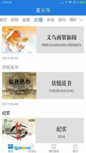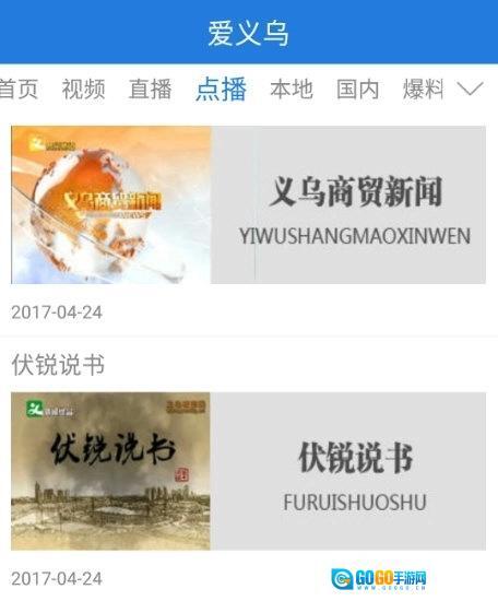 4、在首页界面,点击上方显示栏中的“点播”选项,就能选择义乌商贸新闻、伏锐说书、纪实等节目。