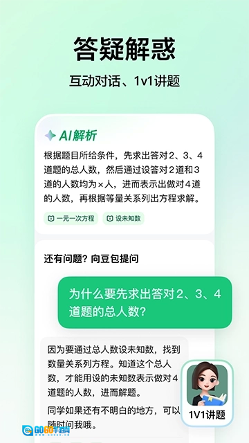 1、当学生在学习过程中碰到难以解决的问题时,能够借助AI答疑功能,迅速获取针对性的解答与专业的指导,从而有效推进学习进程。