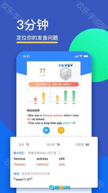 3、借助音素级别的声纹分析技术,能够精准辨别发音上的不足(比如方言口音、连读失误等情况),并给出逐句的评分以及针对性的矫正指导。