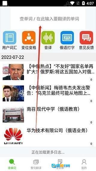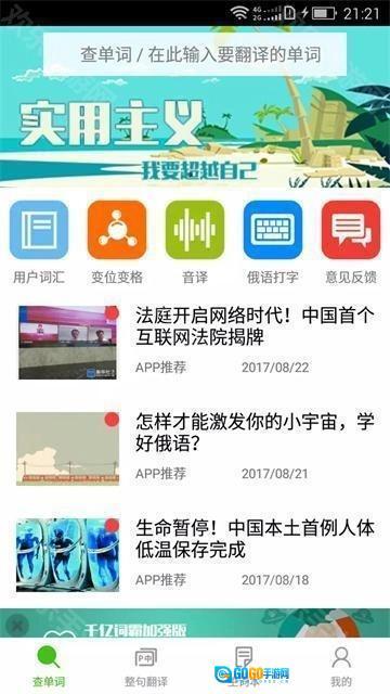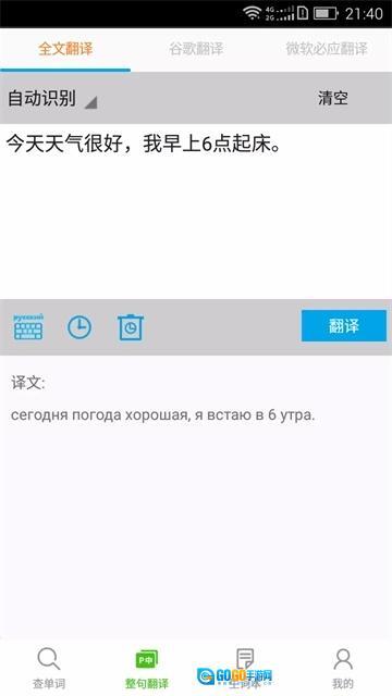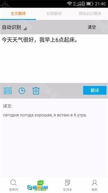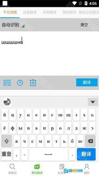1、在本站提供的软件中,进入软件后切换到翻译界面,输入对应的俄语或中文并点击翻译按钮,就能完成翻译操作;此外,软件还会为用户解析相关词语的含义及用法。