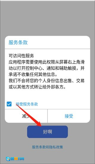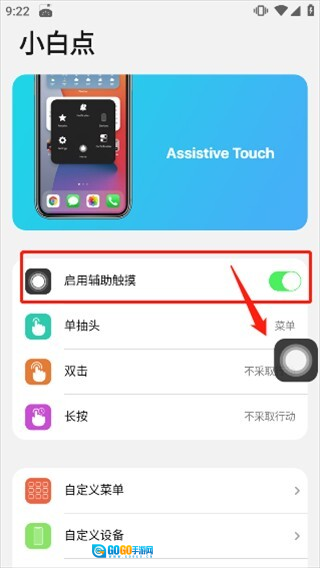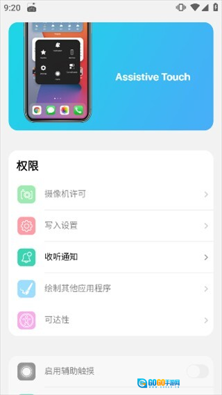 7、把所有权限都开启后,点击“启动辅助触摸”选项,就能成功开启“小白点”功能了。
