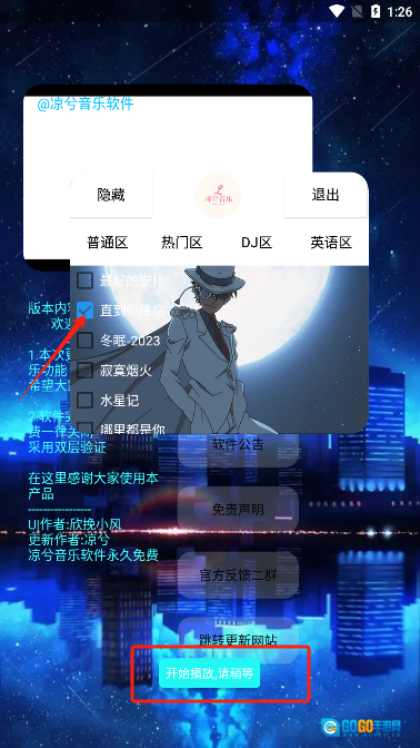 5、在弹出的悬浮页面里挑选你想听的歌曲,点击下方的“播放”按钮就能开始播放了。