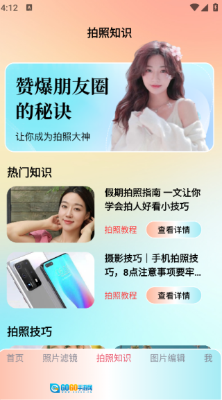 4. 点击页面底部的“拍照知识”板块,就能学习到专业的拍照技巧。