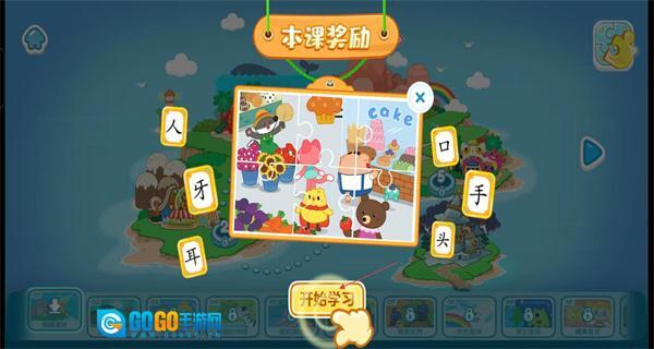 3、进入本课的奖励页面后,会看到汉字和拼图元素,点击“开始学习”按钮,即可进入汉字卡片的学习界面。