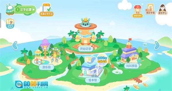 1、打开软件进入主界面,该界面包含游乐园、绘本馆等功能区域,点击“开始识字”按钮即可进入学习单元页面。