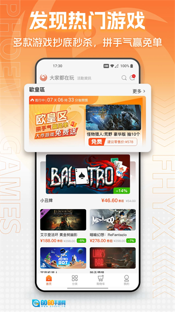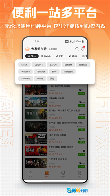 凤凰游戏商城是杭州丘游网络科技有限公司开发的手机游戏平台应用,在这里你能选购海量正版游戏,平台提供专属特惠,让你以更实惠的价格购买,畅享折扣福利。除游戏外,商城还包含游戏激活码、家用游戏机、电脑硬件外设、游戏手办等各类游戏周边产品,全方位满足不同用户的多样化需求。此外,凤凰商城会不定时推出各类特价活动,为用户带来更优质的购物体验。