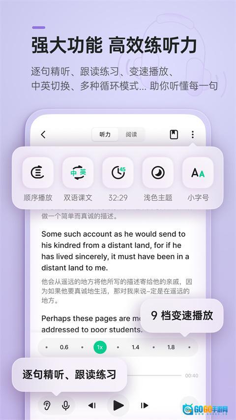 3. 听力训练模式:涵盖单句循环、多句循环、顺序播放、随机播放等多种模式,以满足不同用户的学习需求。