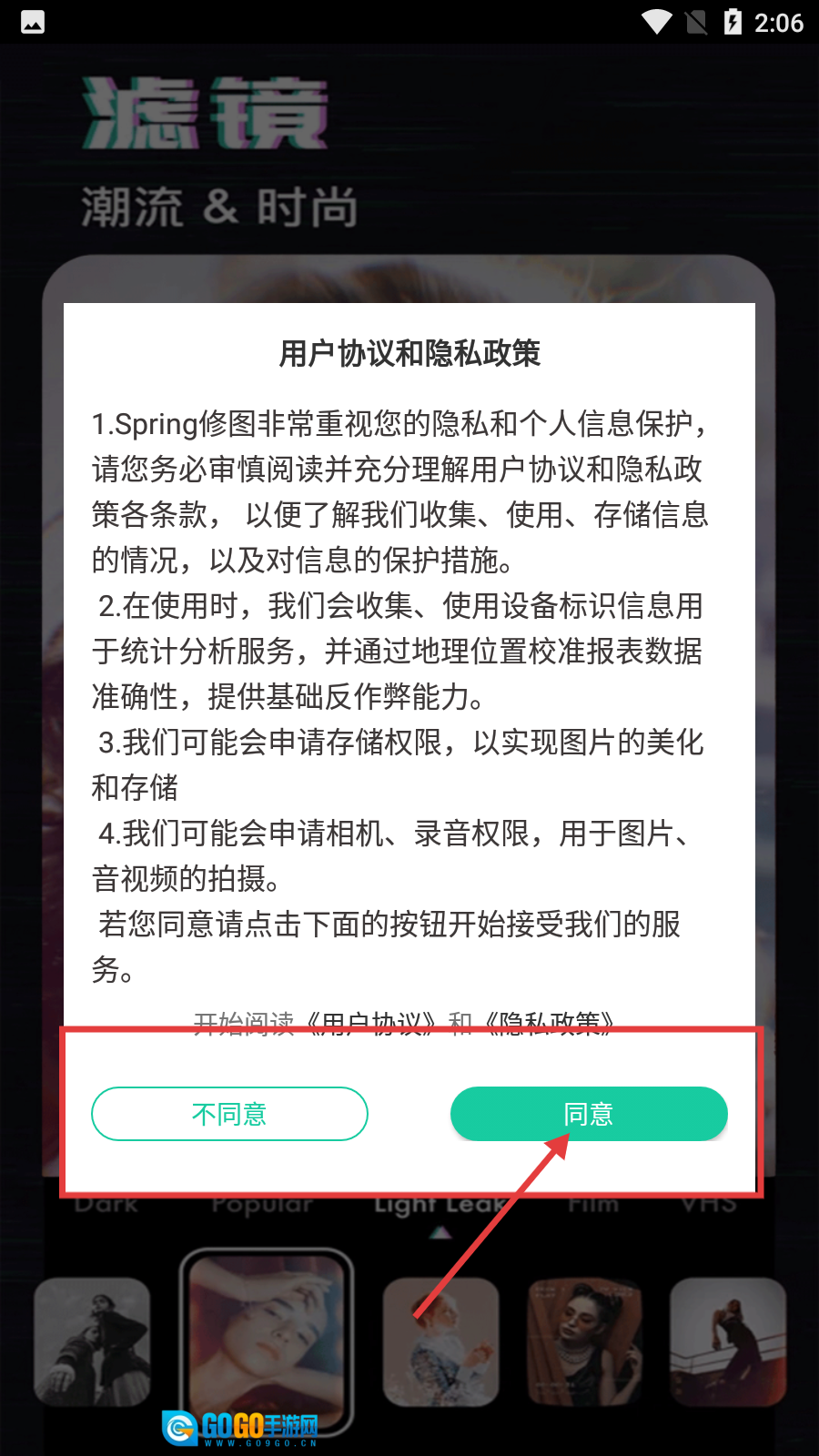 1、在Spring修图的用户协议与隐私政策页面,点击【同意】按钮后,即可进入功能选择界面。