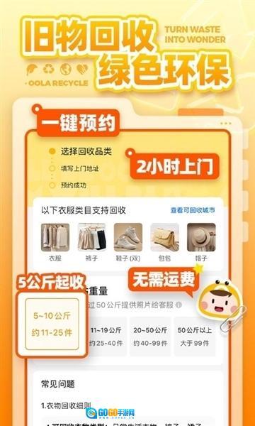 噢啦OOLA平台是广州雷猴软件开发有限公司打造的旧物回收应用,我们不止回收闲置物品,更致力于为用户带来有趣好玩的公益体验,让旧物焕发新的价值。你可以把不再需要的衣物捐赠给有需要的群体,而且噢啦OOLA在爱心与环保活动领域表现出色,感兴趣的用户不妨前往87G网了解!让参与公益成为简单有趣的日常,让闲置物品通过轻松回收,成为助力公益前行的重要力量。
