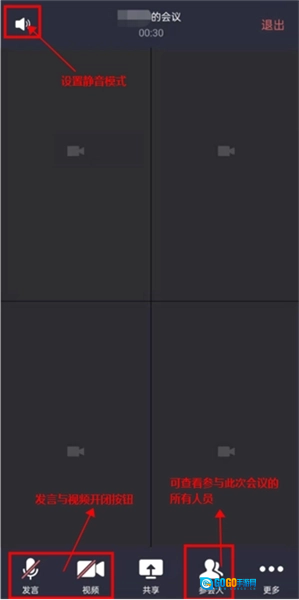 4、进入会议页面后,下图对部分功能进行了标注说明,会议结束时,点击右上角的“退出”按钮即可离开会议。