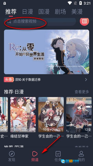 2、在频道页面搜索想看的动漫,输入关键词即可。