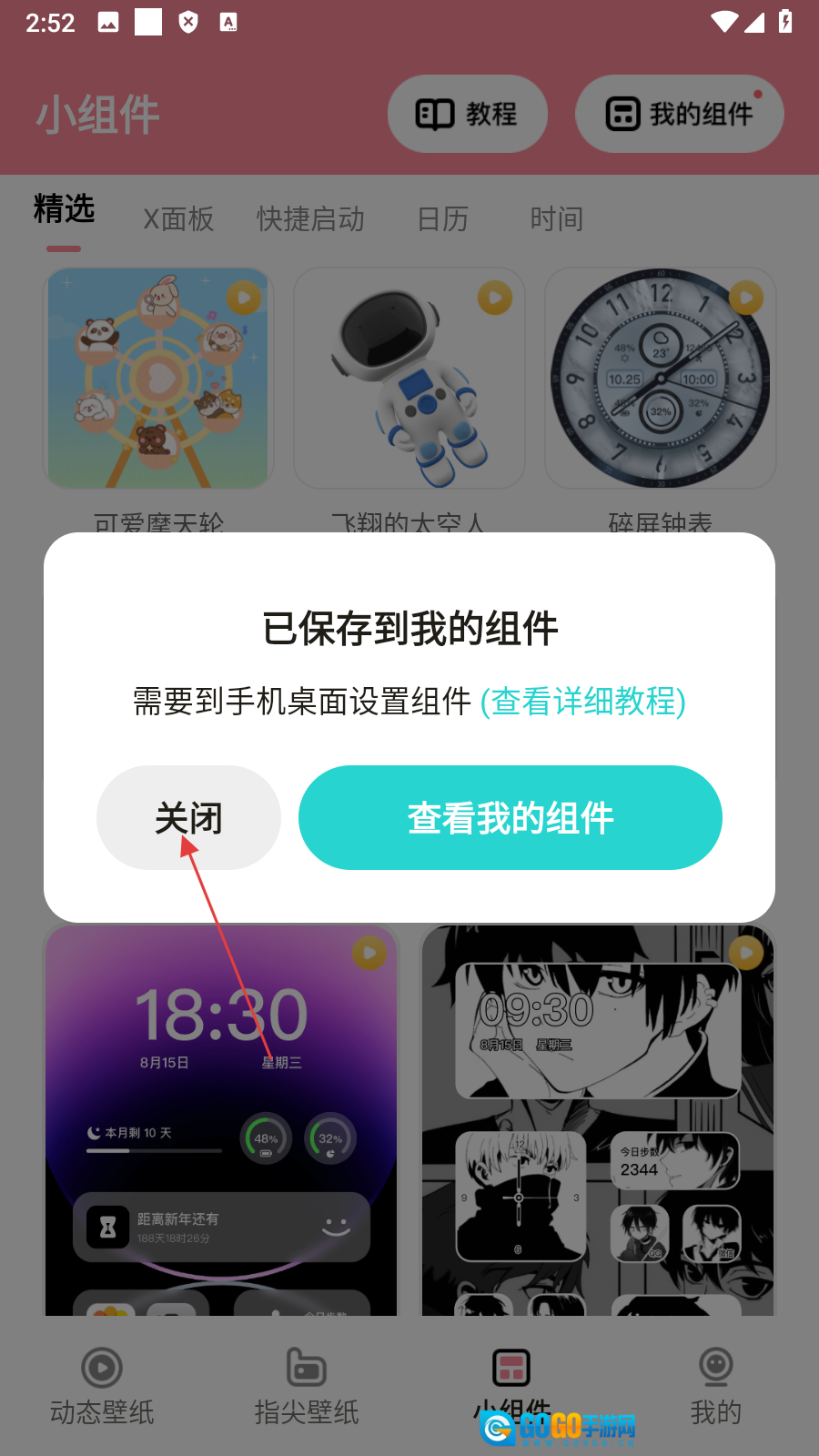 4、在弹出的提示框里,点击【关闭】按钮,就能完成本次组件的保存流程。