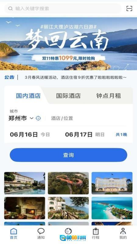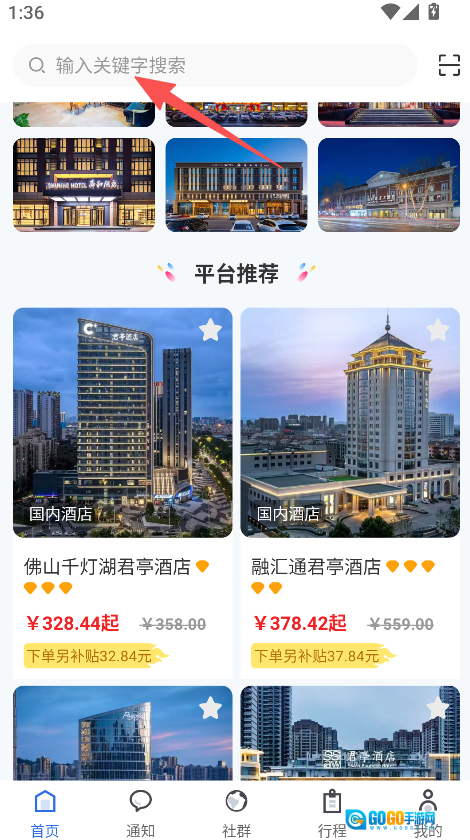 1、进入首页,使用搜索栏输入关键词,查找酒店。
