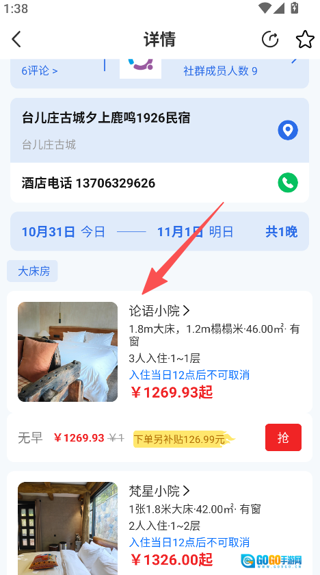 3、点击进入酒店详情页,查看房型、价格、联系电话等相关信息,为预订做准备。