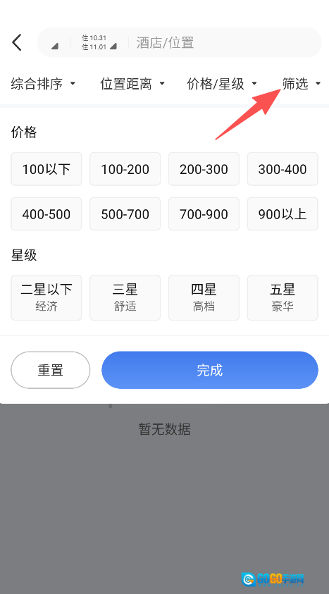 2、打开筛选界面,选定价格范围与星级标准,从而精准锁定目标酒店。