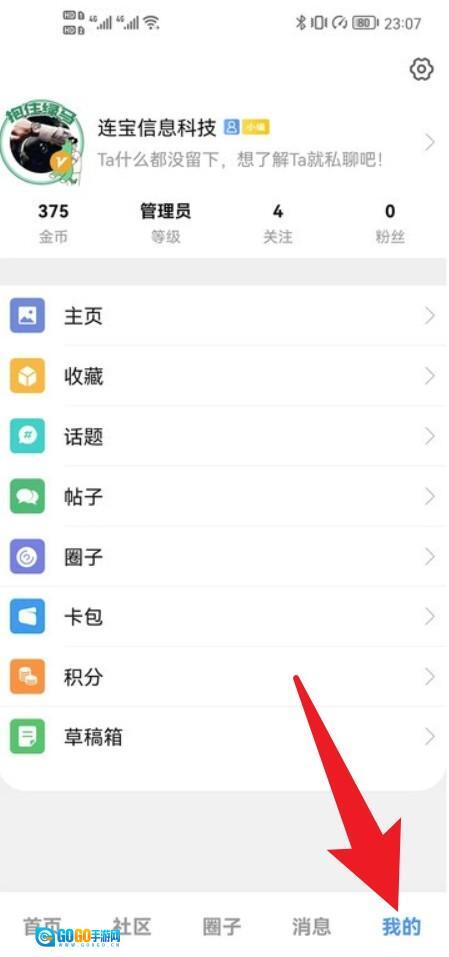 4. 进入“我的”页面后,你可以查看主页资料、收藏内容、发布话题、卡包积分、草稿箱等账号相关功能,并对这些功能进行统一管理。