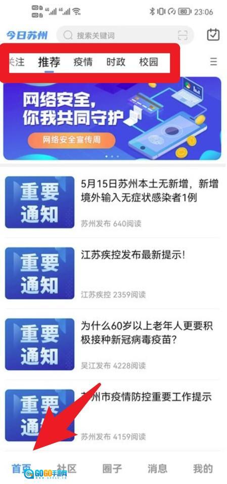 1. 打开App进入首页后,能浏览苏州本地的病情通报与政策公告,通过顶部分类栏还可以切换查看推荐、时政、校园等不同板块的内容。