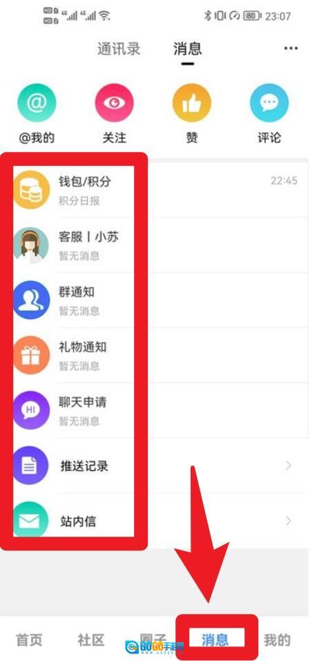 3. 点击底部的消息按钮,即可查看系统发送的群通知、客服消息、积分提醒、聊天申请等各类信息,实现集中收取,避免遗漏任何内容。