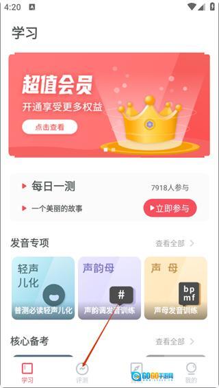 1、在学习页面,点击底部的【评测】选项,即可进入评测界面。