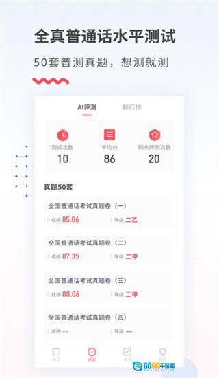 2、打造全真模拟考试场景,精准还原普通话水平测试的各类题型与完整考试流程,并支持即时评分及生成详细的错误分析报告。