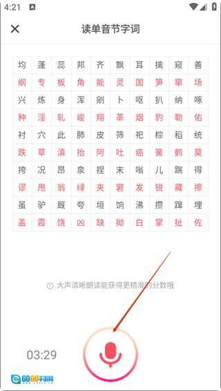 4、进入测试界面后,点击麦克风图标,即可开启普通话测试,通过朗读字词来完成测试流程。
