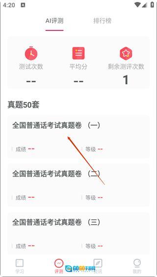 2、在评测页面,选择类似【全国普通话考试真题卷(一)】这样的真题卷,就能进入该真题卷的练习页面。