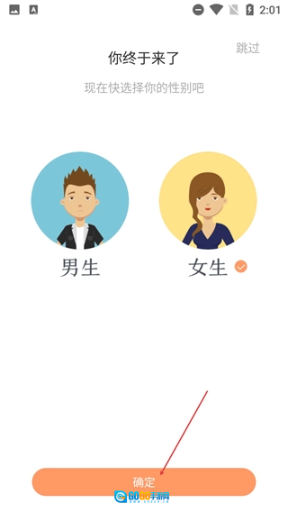 2、进入性别选择界面,可选择【男生】或【女生】选项,选定后点击下方【确定】按钮,也可点击右上角【跳过】。