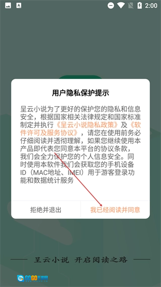 1、打开应用后,会弹出【用户隐私保护提示】,需阅读【呈云小说隐私政策】及【软件许可及服务协议】,点击【我已经阅读并同意】以继续。