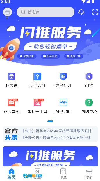 1、打开转单宝软件后进入首页,可查看门推服务相关内容,了解当前门店推广与业务概况。