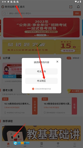 1、打开软件,点击底端的“首页”选项,然后点击“地区”选项,点击“考试地区”选项。