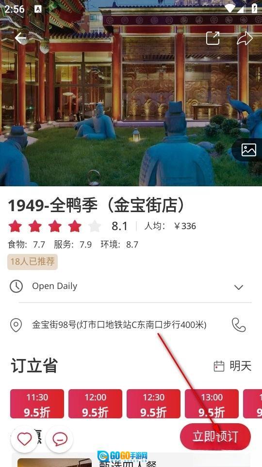 在餐厅详情页面的右下角点击立即预订。