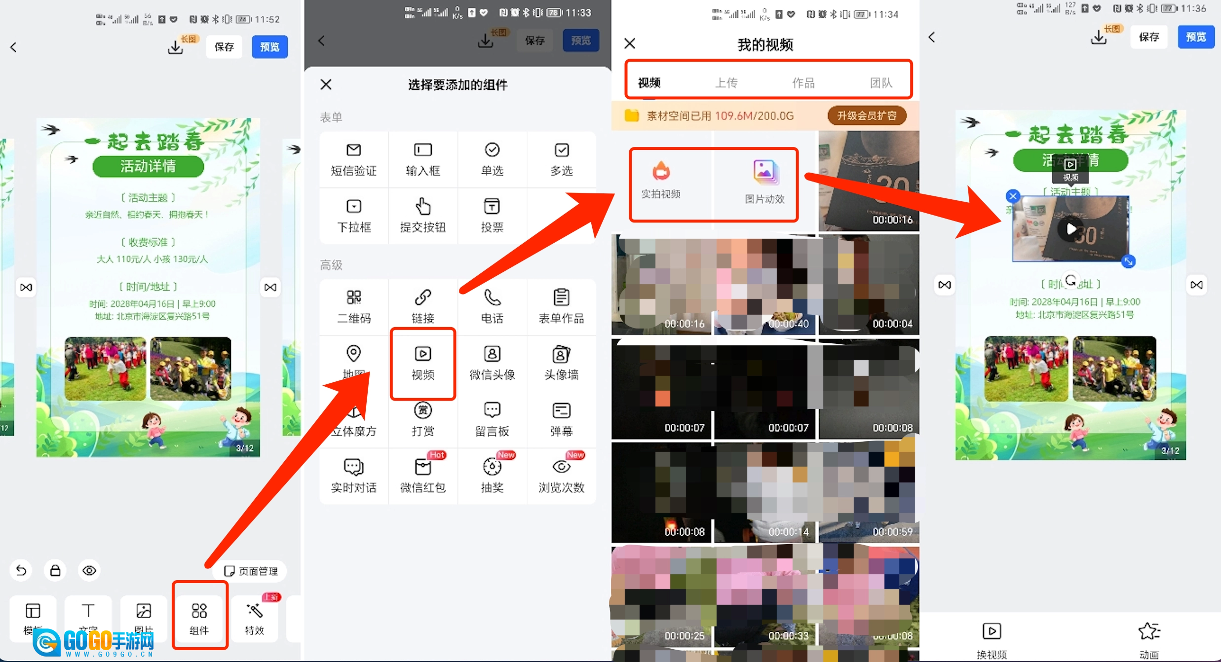 1、点击底部的“组件”按钮,接着选择“视频”选项,系统会自动读取本地视频文件,此时挑选你想要上传的视频就能完成操作。