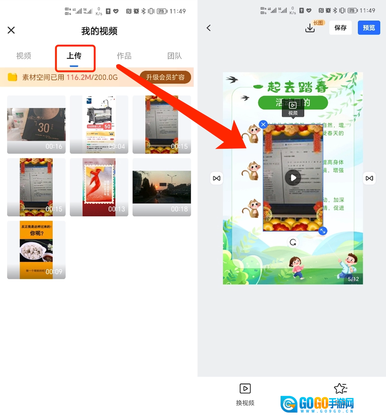 2、上传视频时,点击“上传”按钮,可直接调取易企秀的视频作品,选择对应作品完成上传操作即可。