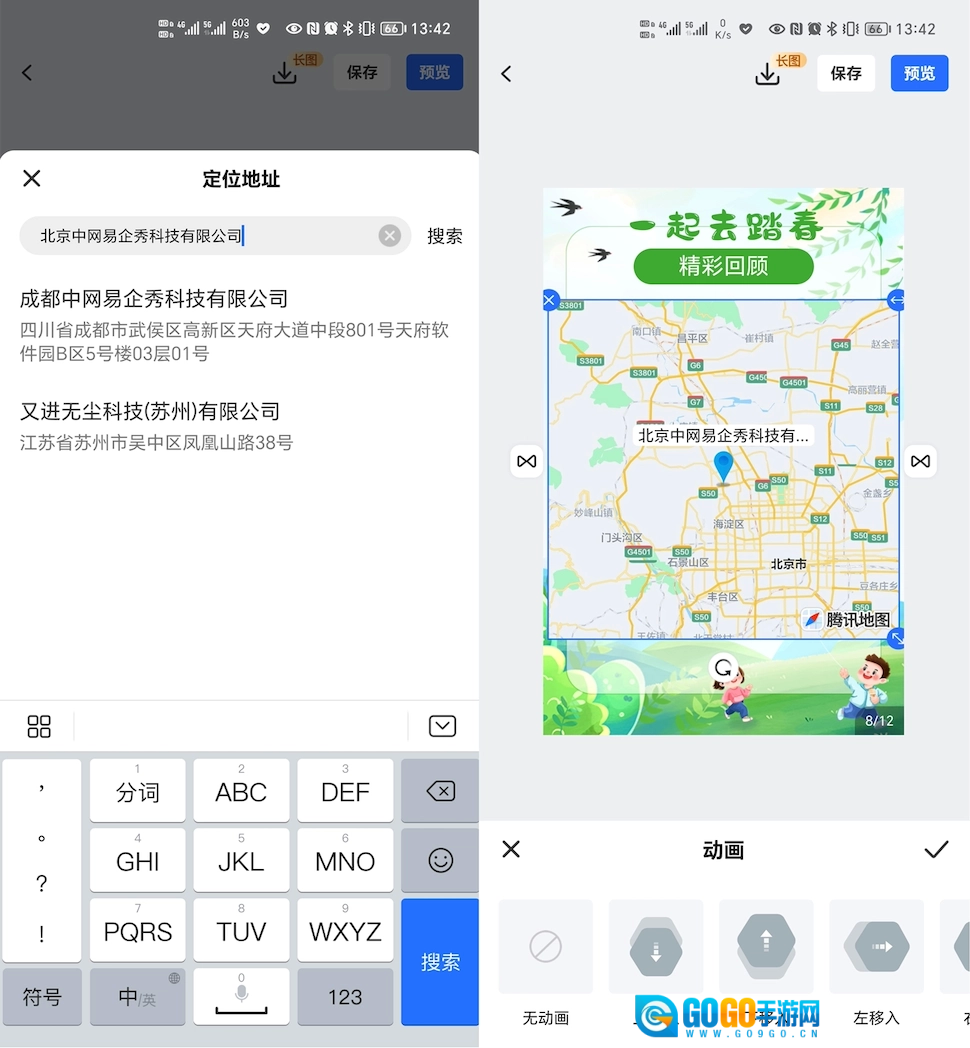 2.可通过输入地址名称调整地图显示的位置,也能拖拽地址完成定位;此外还能对地图进行动画设置。