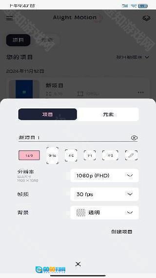 1. 并安装好Axcven剪辑后,打开软件,点击首页中间的加号新建项目,随后依据自身需求设置名字、比例、分辨率、帧率及背景。