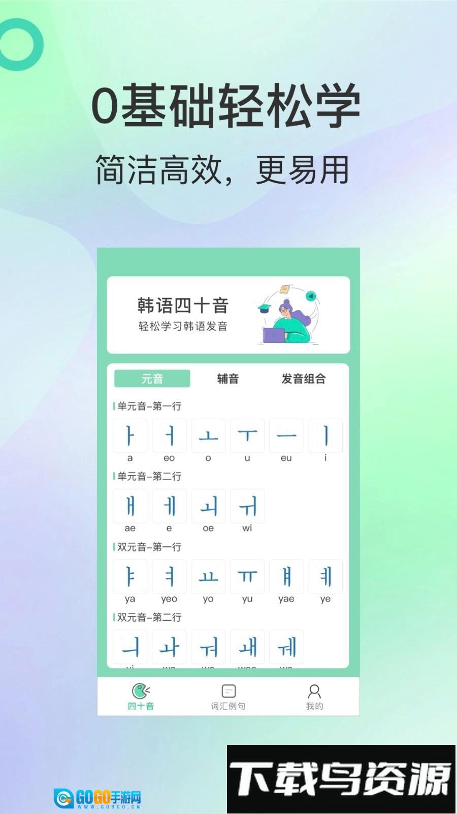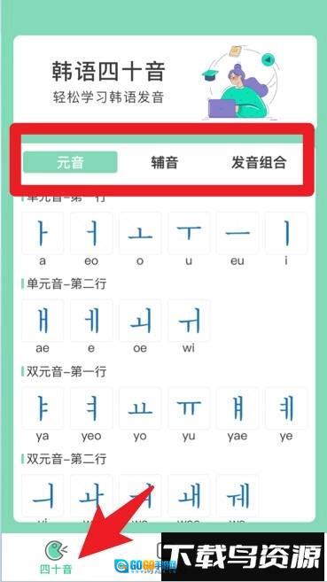 2、进入韩语四十音学习界面,可选择元音、辅音或发音组合分类,系统会提供清晰发音示例与对照表;