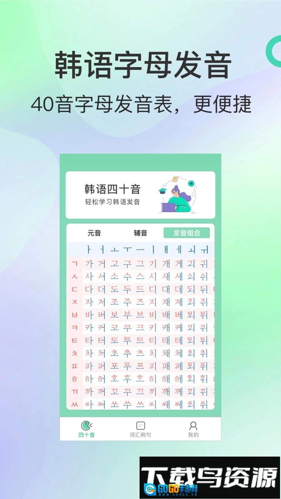 2、收录399个韩语字母,每个字母均可点击发音,并提供常用单词示例与标准读音;